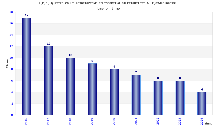 | Anno | Firme | Importi | Media | Naz. | Reg. | Prov. | Comu. |