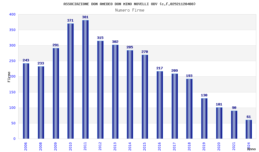 | Anno | Firme | Importi | Media | Naz. | Reg. | Prov. | Comu. |