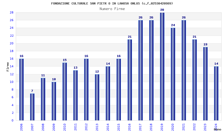 | Anno | Firme | Importi | Media | Naz. | Reg. | Prov. | Comu. |