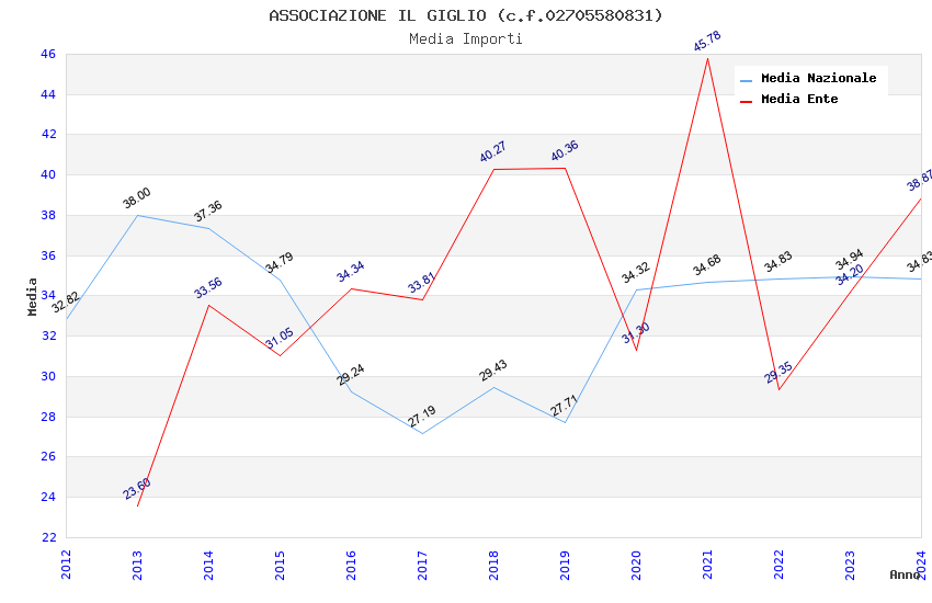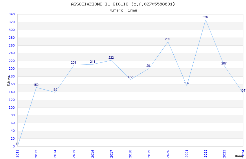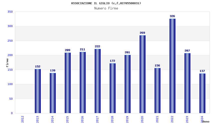 | Anno | Firme | Importi | Media | Naz. | Reg. | Prov. | Comu. |