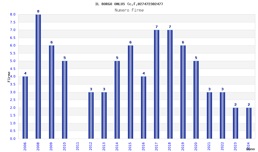 | Anno | Firme | Importi | Media | Naz. | Reg. | Prov. | Comu. |