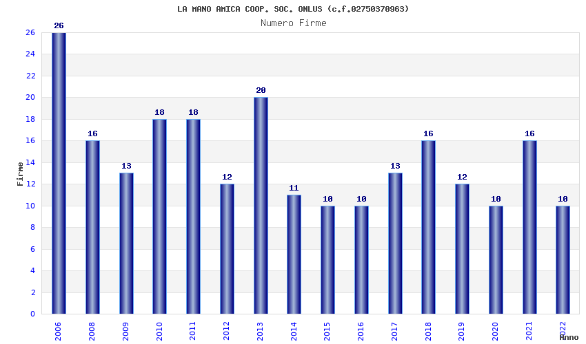 | Anno | Firme | Importi | Media | Naz. | Reg. | Prov. | Comu. |