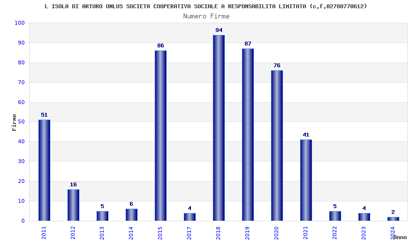 | Anno | Firme | Importi | Media | Naz. | Reg. | Prov. | Comu. |