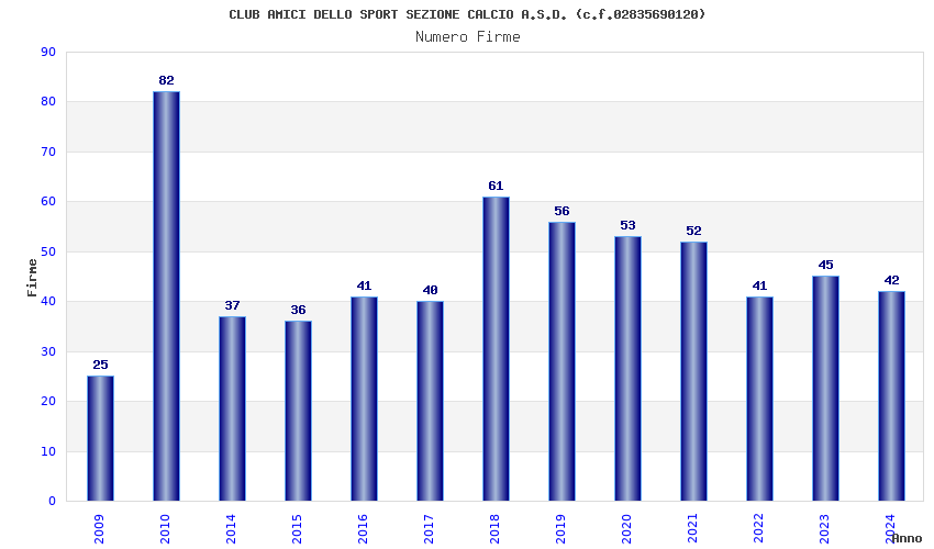 | Anno | Firme | Importi | Media | Naz. | Reg. | Prov. | Comu. |