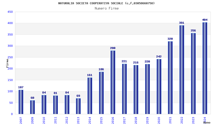 | Anno | Firme | Importi | Media | Naz. | Reg. | Prov. | Comu. |