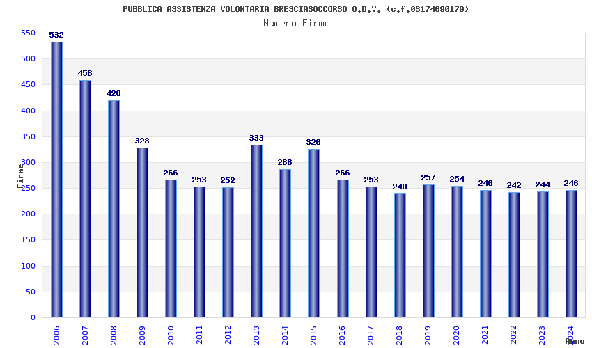 | Anno | Firme | Importi | Media | Naz. | Reg. | Prov. | Comu. |