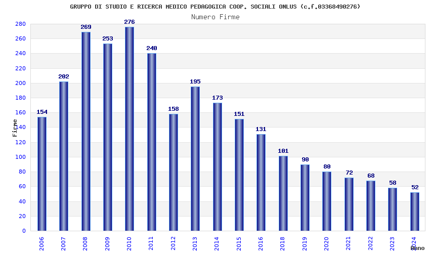 | Anno | Firme | Importi | Media | Naz. | Reg. | Prov. | Comu. |