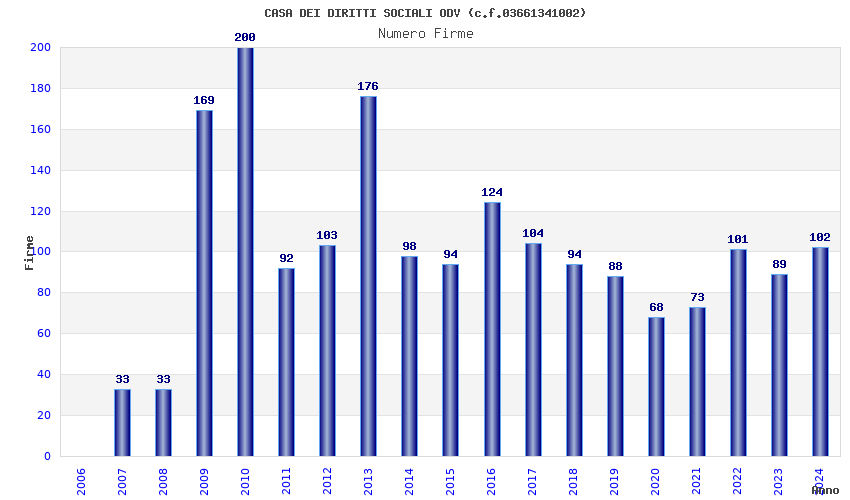 | Anno | Firme | Importi | Media | Naz. | Reg. | Prov. | Comu. |