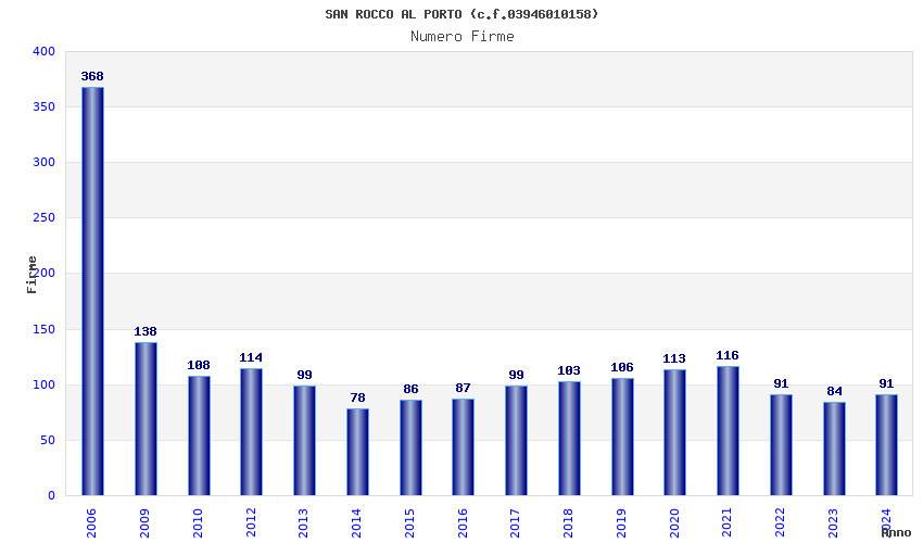 | Anno | Firme | Importi | Media | Naz. | Reg. | Prov. | Comu. |