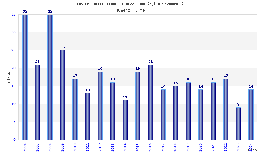 | Anno | Firme | Importi | Media | Naz. | Reg. | Prov. | Comu. |