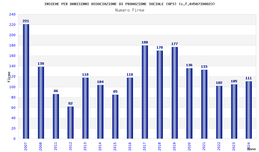| Anno | Firme | Importi | Media | Naz. | Reg. | Prov. | Comu. |
