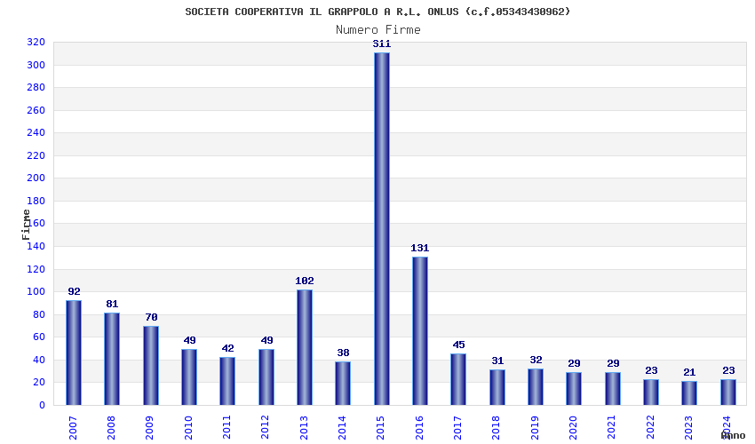 | Anno | Firme | Importi | Media | Naz. | Reg. | Prov. | Comu. |