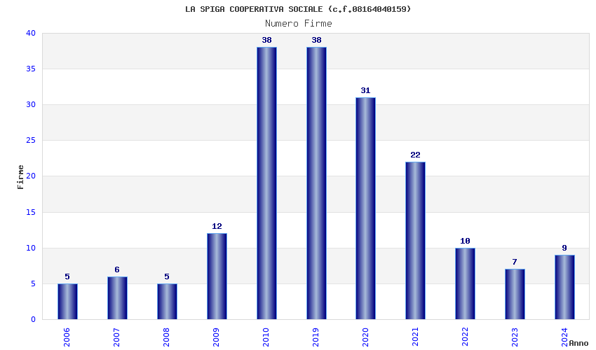 | Anno | Firme | Importi | Media | Naz. | Reg. | Prov. | Comu. |