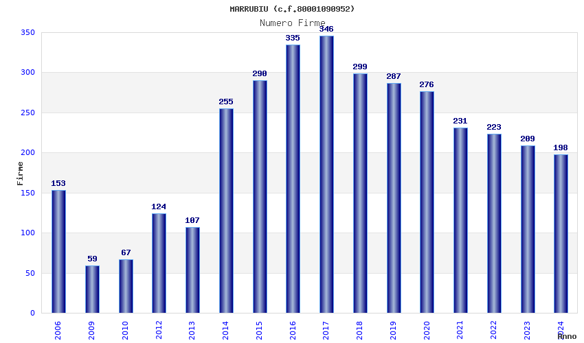 | Anno | Firme | Importi | Media | Naz. | Reg. | Prov. | Comu. |