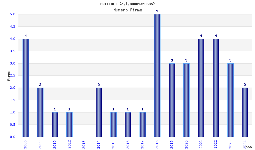 | Anno | Firme | Importi | Media | Naz. | Reg. | Prov. | Comu. |