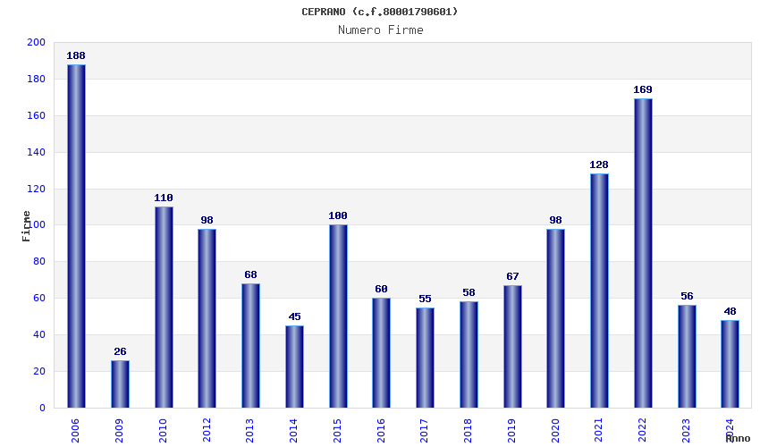 | Anno | Firme | Importi | Media | Naz. | Reg. | Prov. | Comu. |