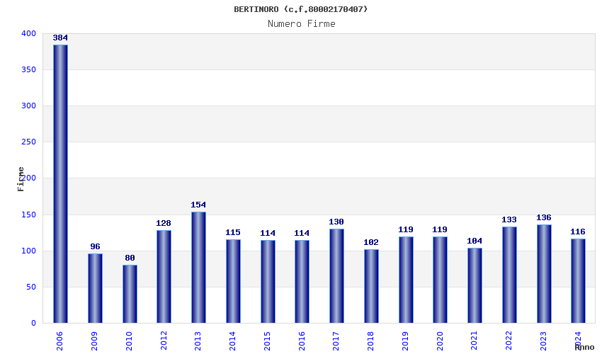 | Anno | Firme | Importi | Media | Naz. | Reg. | Prov. | Comu. |