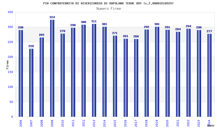 | Anno | Firme | Importi | Media | Naz. | Reg. | Prov. | Comu. |