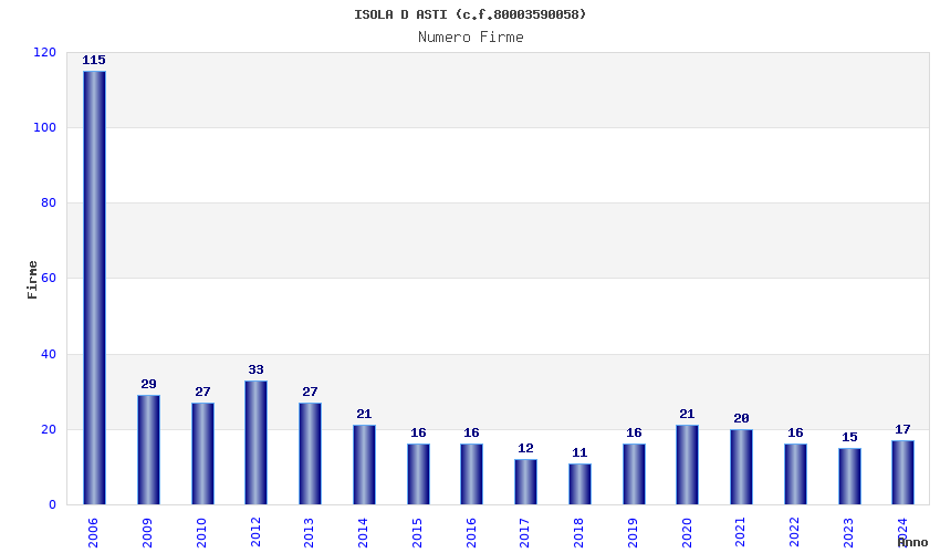| Anno | Firme | Importi | Media | Naz. | Reg. | Prov. | Comu. |