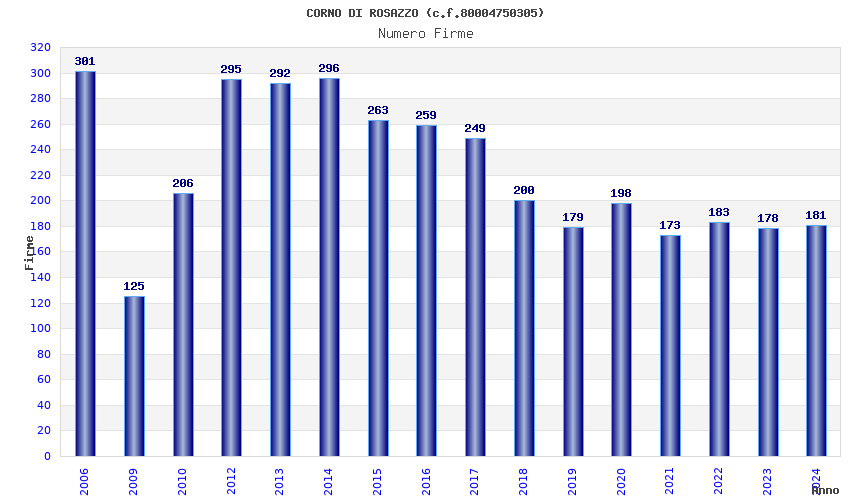 | Anno | Firme | Importi | Media | Naz. | Reg. | Prov. | Comu. |