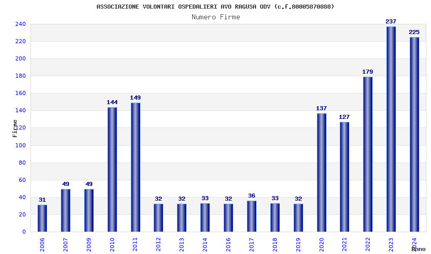 | Anno | Firme | Importi | Media | Naz. | Reg. | Prov. | Comu. |