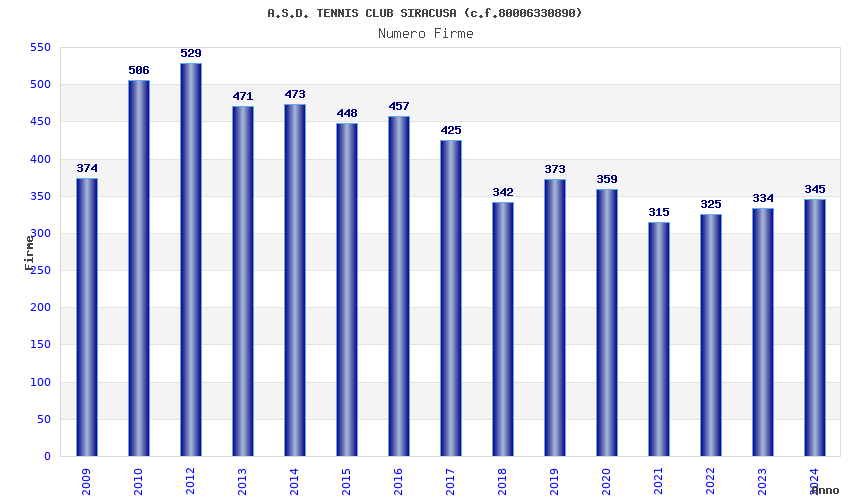 | Anno | Firme | Importi | Media | Naz. | Reg. | Prov. | Comu. |