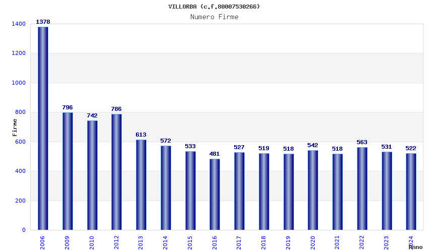 | Anno | Firme | Importi | Media | Naz. | Reg. | Prov. | Comu. |