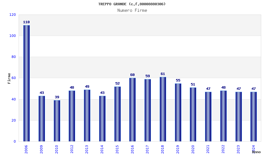 | Anno | Firme | Importi | Media | Naz. | Reg. | Prov. | Comu. |