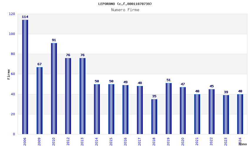 | Anno | Firme | Importi | Media | Naz. | Reg. | Prov. | Comu. |