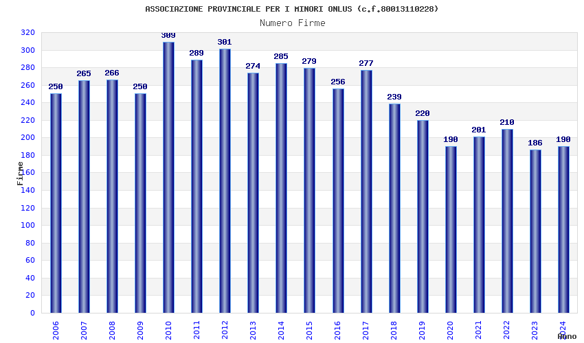 | Anno | Firme | Importi | Media | Naz. | Reg. | Prov. | Comu. |