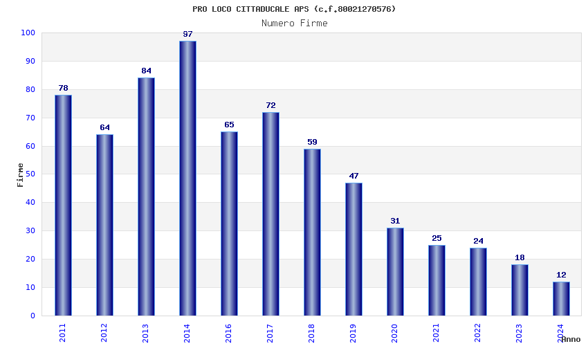 | Anno | Firme | Importi | Media | Naz. | Reg. | Prov. | Comu. |
