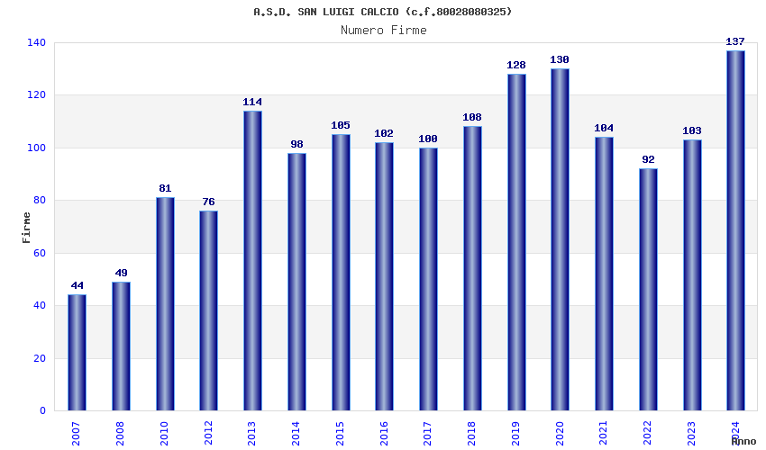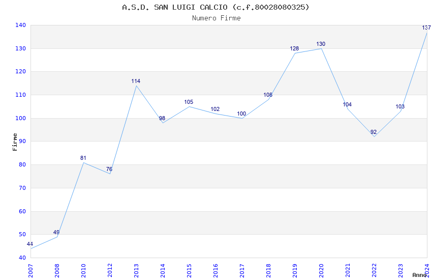 | 2020 | 130 | 5.835,16 | 44,89 | 9.703 | 180 | 42 | 37 |