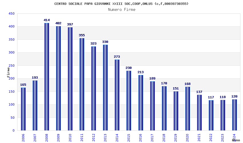 | Anno | Firme | Importi | Media | Naz. | Reg. | Prov. | Comu. |