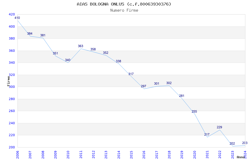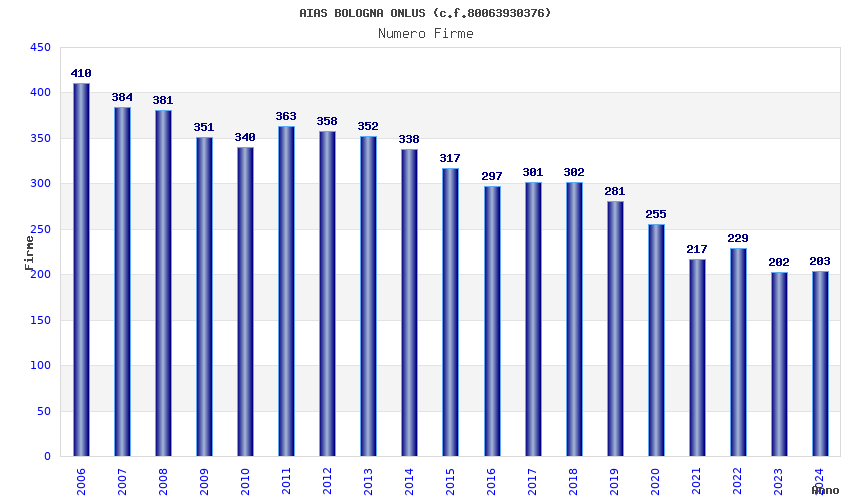 | Anno | Firme | Importi | Media | Naz. | Reg. | Prov. | Comu. |