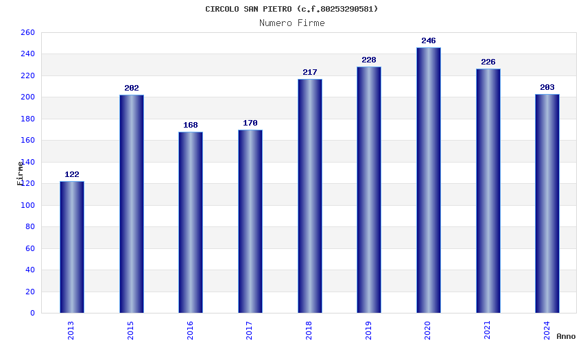 | Anno | Firme | Importi | Media | Naz. | Reg. | Prov. | Comu. |