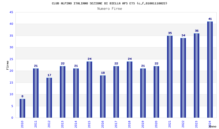 | Anno | Firme | Importi | Media | Naz. | Reg. | Prov. | Comu. |