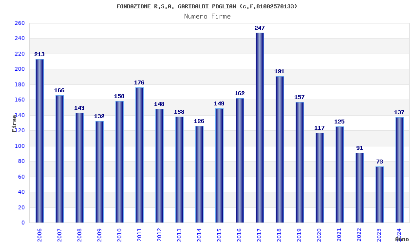 | Anno | Firme | Importi | Media | Naz. | Reg. | Prov. | Comu. |