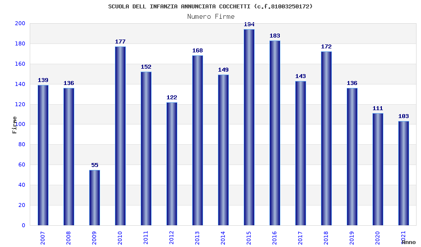 | Anno | Firme | Importi | Media | Naz. | Reg. | Prov. | Comu. |