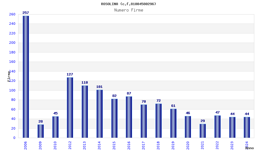 | Anno | Firme | Importi | Media | Naz. | Reg. | Prov. | Comu. |