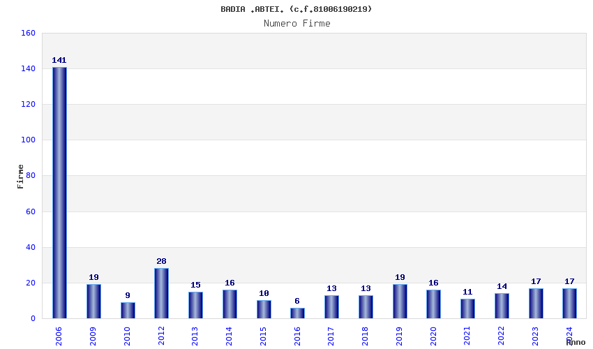 | Anno | Firme | Importi | Media | Naz. | Reg. | Prov. | Comu. |
