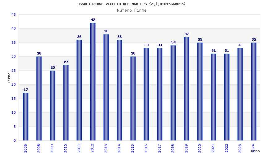 | Anno | Firme | Importi | Media | Naz. | Reg. | Prov. | Comu. |