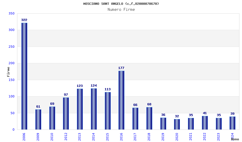 | Anno | Firme | Importi | Media | Naz. | Reg. | Prov. | Comu. |