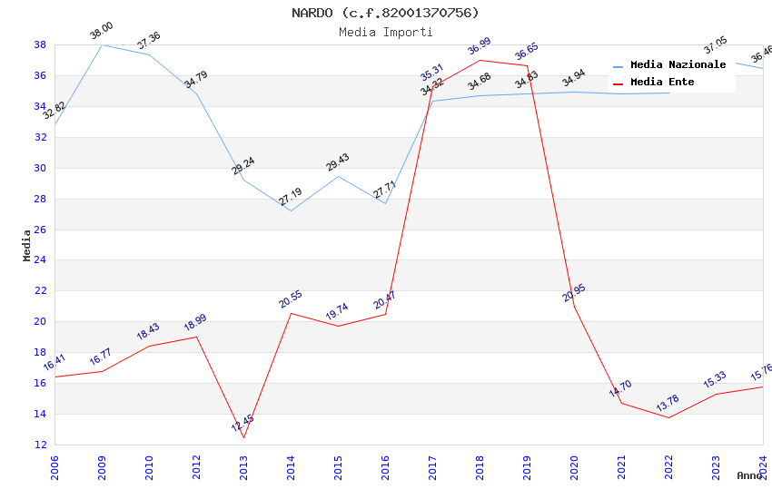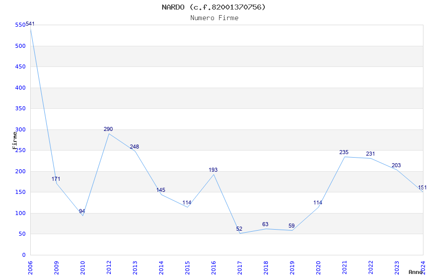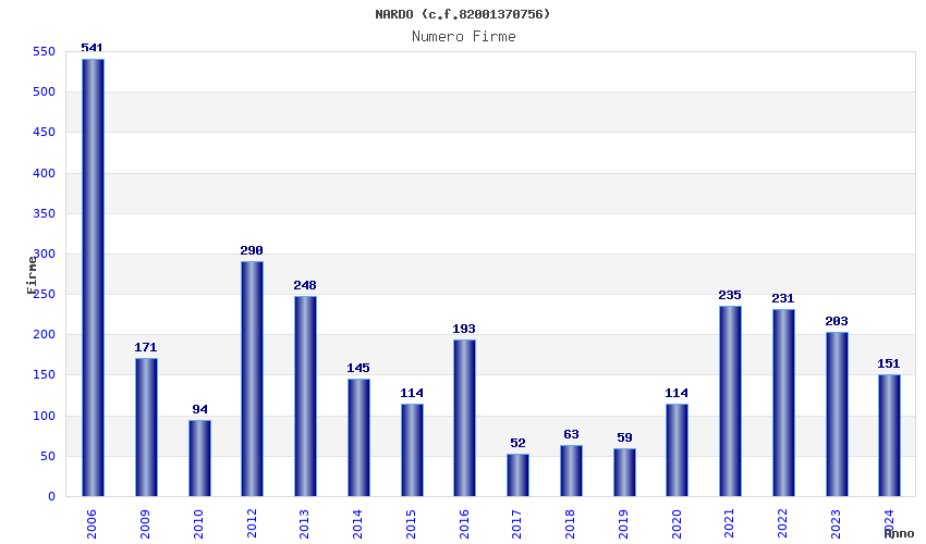 | Anno | Firme | Importi | Media | Naz. | Reg. | Prov. | Comu. |