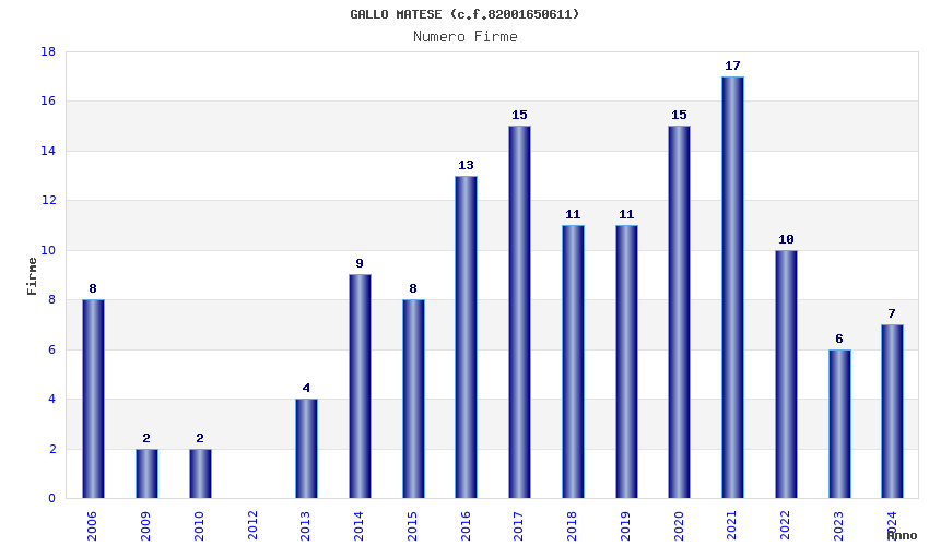 | Anno | Firme | Importi | Media | Naz. | Reg. | Prov. | Comu. |