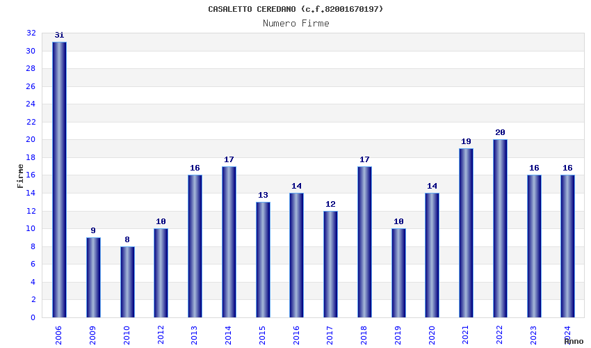 | Anno | Firme | Importi | Media | Naz. | Reg. | Prov. | Comu. |