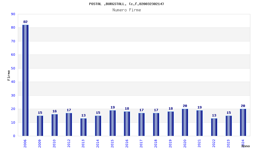 | Anno | Firme | Importi | Media | Naz. | Reg. | Prov. | Comu. |