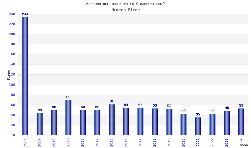 | Anno | Firme | Importi | Media | Naz. | Reg. | Prov. | Comu. |