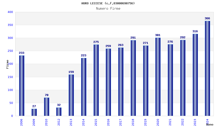 | Anno | Firme | Importi | Media | Naz. | Reg. | Prov. | Comu. |