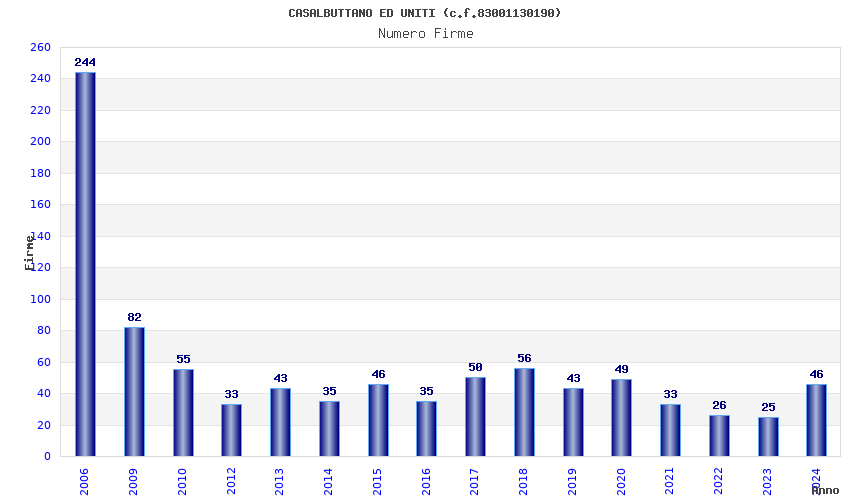 | Anno | Firme | Importi | Media | Naz. | Reg. | Prov. | Comu. |