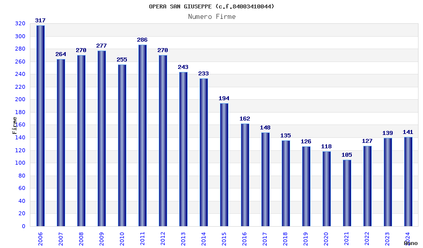 | Anno | Firme | Importi | Media | Naz. | Reg. | Prov. | Comu. |